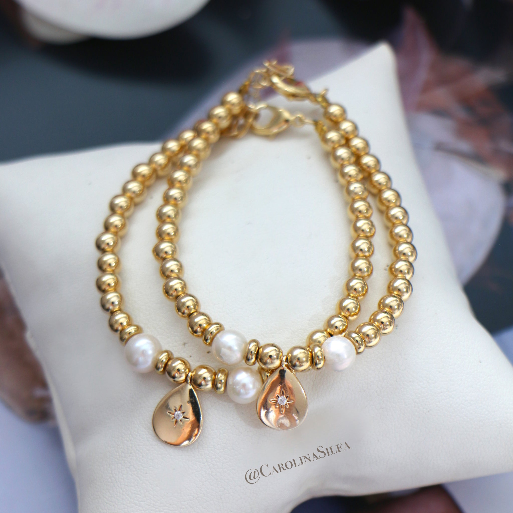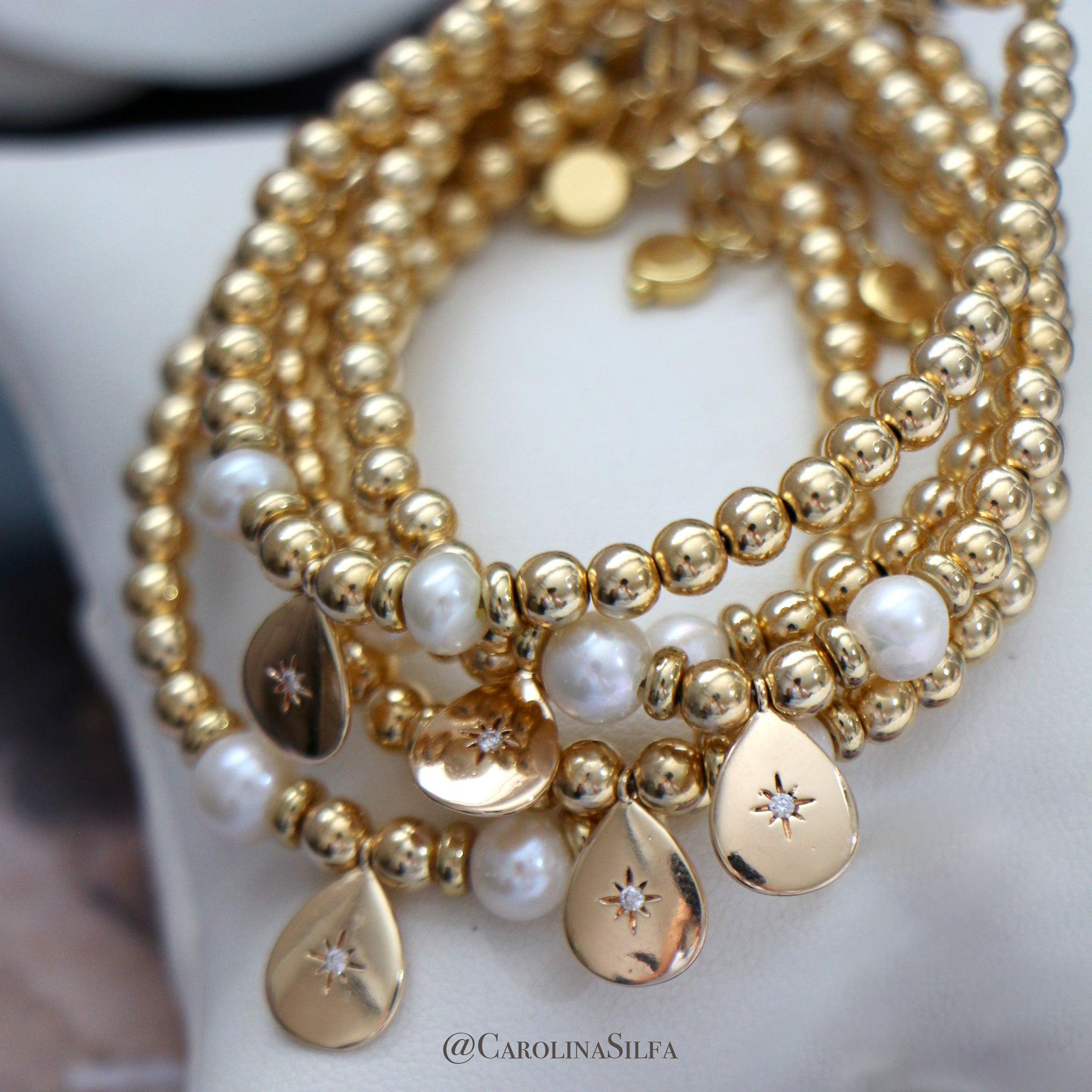 Pulsera en balines laminado en oro, detalles en perlas y medalla en forma de gota con zirconía. Tamaño aproximado 5.5 a 9 pulgadas de circunferencia. Pulsera extendible. Se ajusta al grosor de tu muñeca.