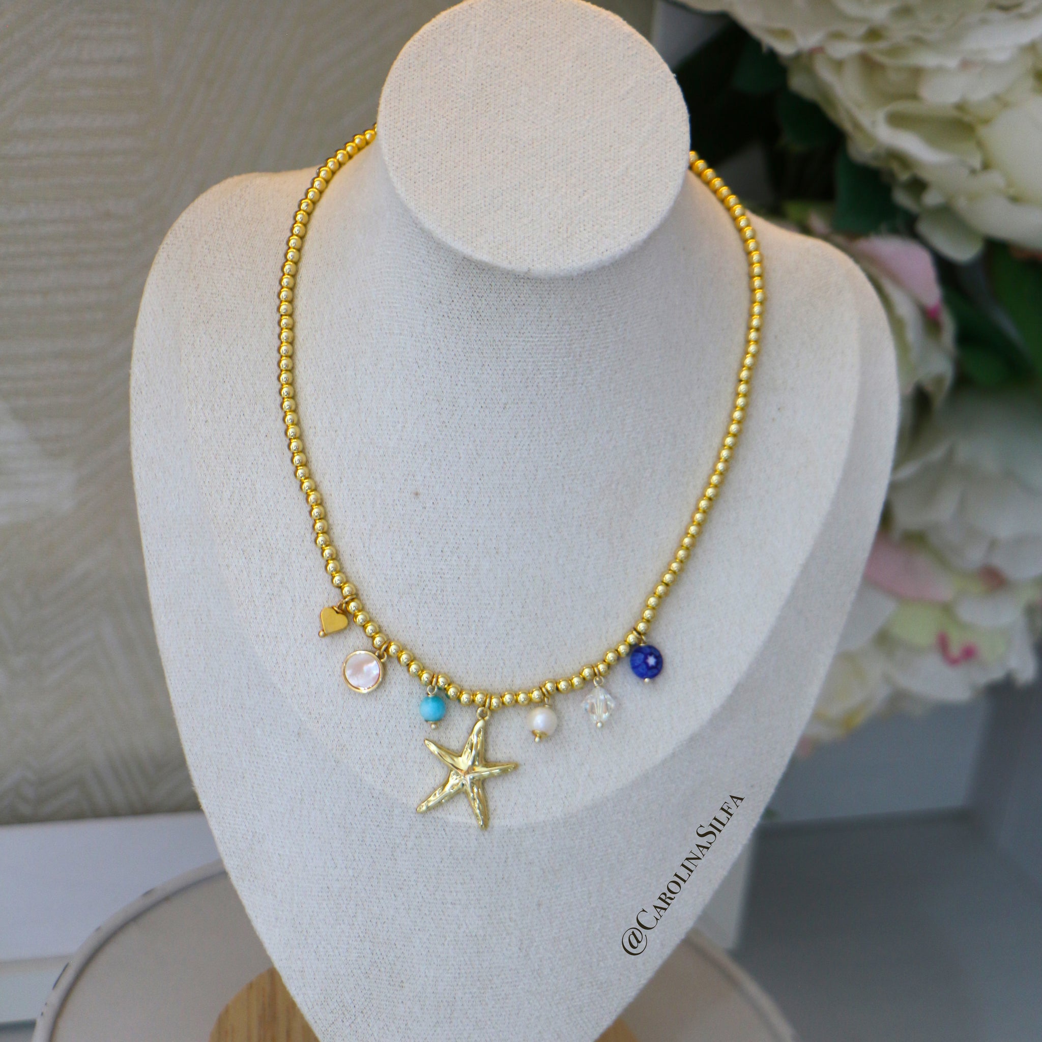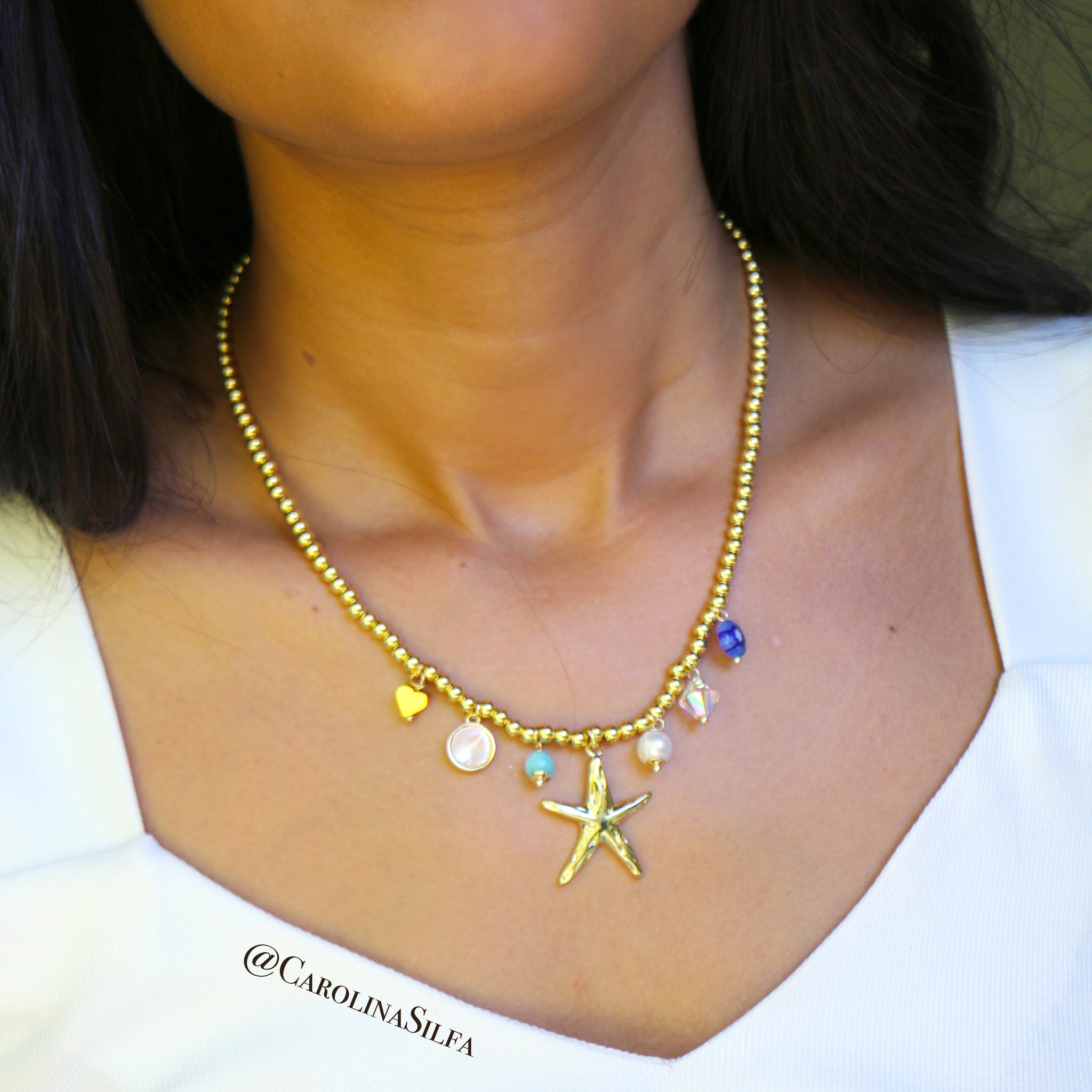 Collar estilo choker en balín laminado, Cristales y piezas laminada en oro. Tamaño aproximado 14 pulgadas de largo más cadena extendible de 2 pulgadas.