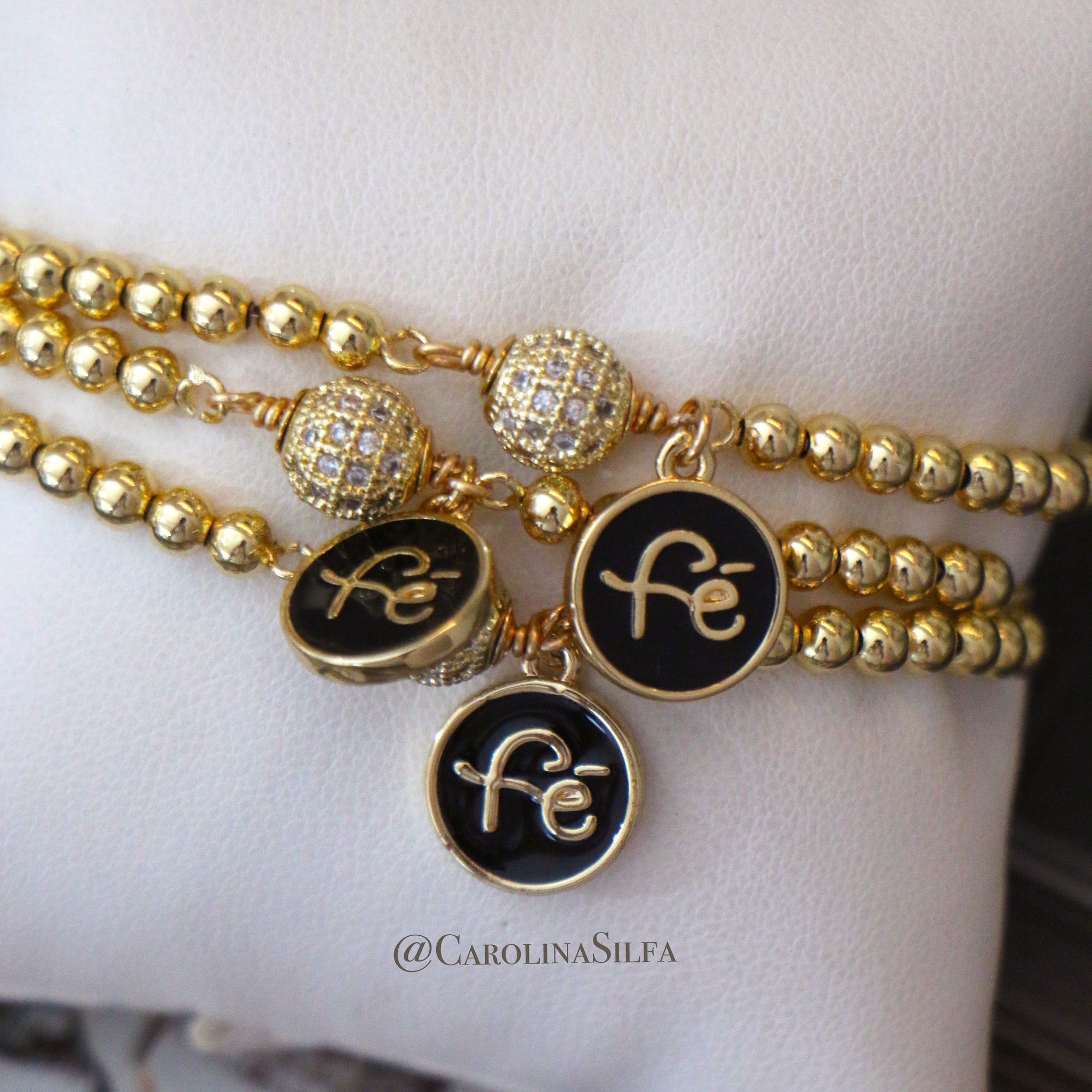 Pulsera en balín laminada en oro y combinación esfera con zirconias. Tamaño aproximado 6.7 pulgadas de largo. Ajustable al grosor de tu muñeca.