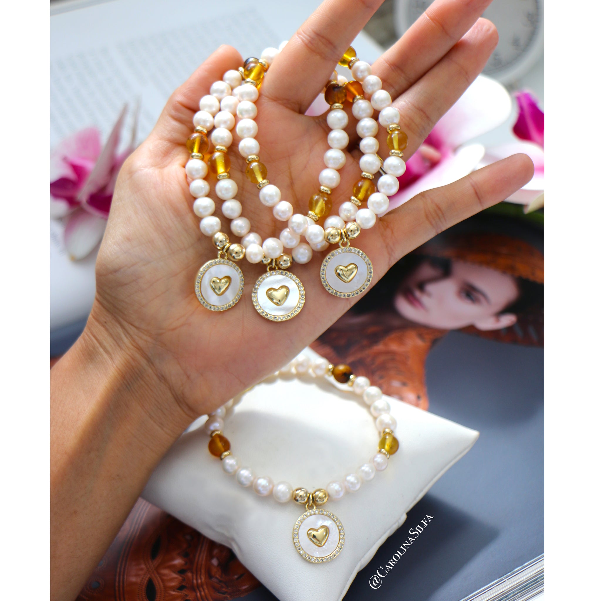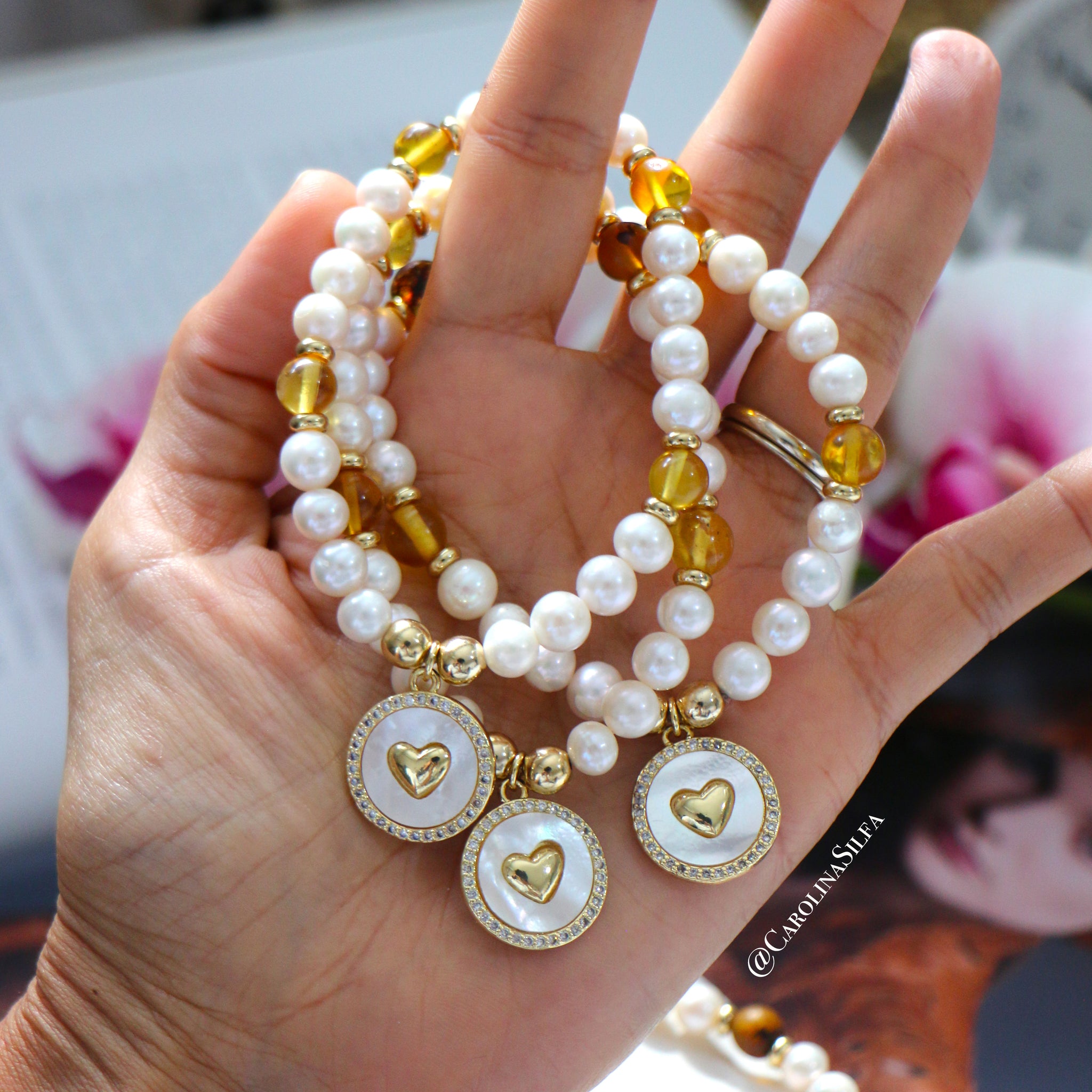 Pulsera en perlas y ámbar, con detalles laminada en oro y medalla de Corazón en Nácar. Goma extendible. Tamaño aproximado 4 pulgadas de circunferencia.